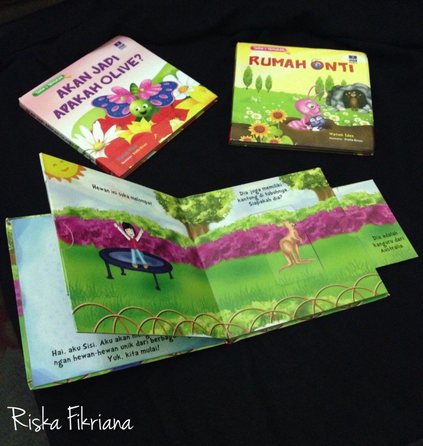 Seperti halnya buku Watiek Ideo ini. Seperti karya-karyanya yang lain, selalu ada pesan atau informasi yang disampaikan kepada pembacanya. Kali ini, buku dongeng yang dihadirkan berbeda dari kebanyakan. Anak, diajak bermain tebak-tebakan. Setelah menjawab pertanyaan yang diberikan tiap halaman, anak bisa menarik kertas yang terselip di halaman. Daannn.. Jawaban dari pertanyaan pun ditemukan. Seri buku ini memiliki tiga cerita, yaitu Akan Jadi Apakah Olive? Rumah Onti dan Keliling Dunia.