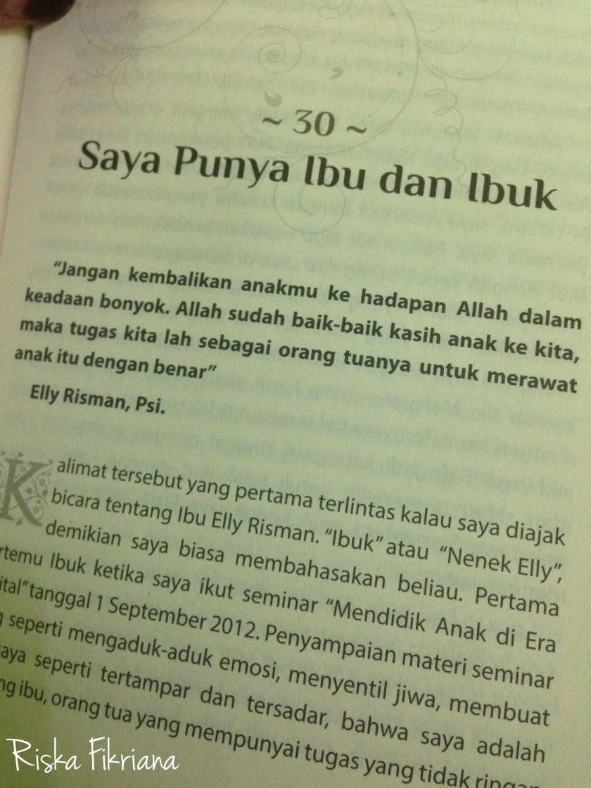 Tulisan-tulisan dalam buku ini diceritakan oleh orang-orang yang mendapatkan pengalaman langsung dari bu Elly. Tidak hanya para ibu, ada juga tulisan beberapa Ayah. Hampir semuanya, mengalami masalah dalam pengasuhan anaknya. Komunikasi yang tidak terjalin baik, egois dan masih banyak lagi. Mengenal Ibu Elly Risman, kata mereka, bukan hanya mengenal ilmu parenting sebagai sebuah pengetahuan dan keterampilan. Tapi yang terpenting adalah kesungguhan untuk menjadi orangtua yang benar-benar sadar dan paham amanah yang kita emban dari sang Maha Pencipta. Ya, itulah yang sejak awal ingin saya sadari. Saya ingin memutuskan benang merah pola asuh orangtua saya terdahulu. Bukan menganggap pola asuh mereka tidak baik. Hanya saja, saya ingin menyesuaikan dan menjadi lebih baik lagi. **curhat**