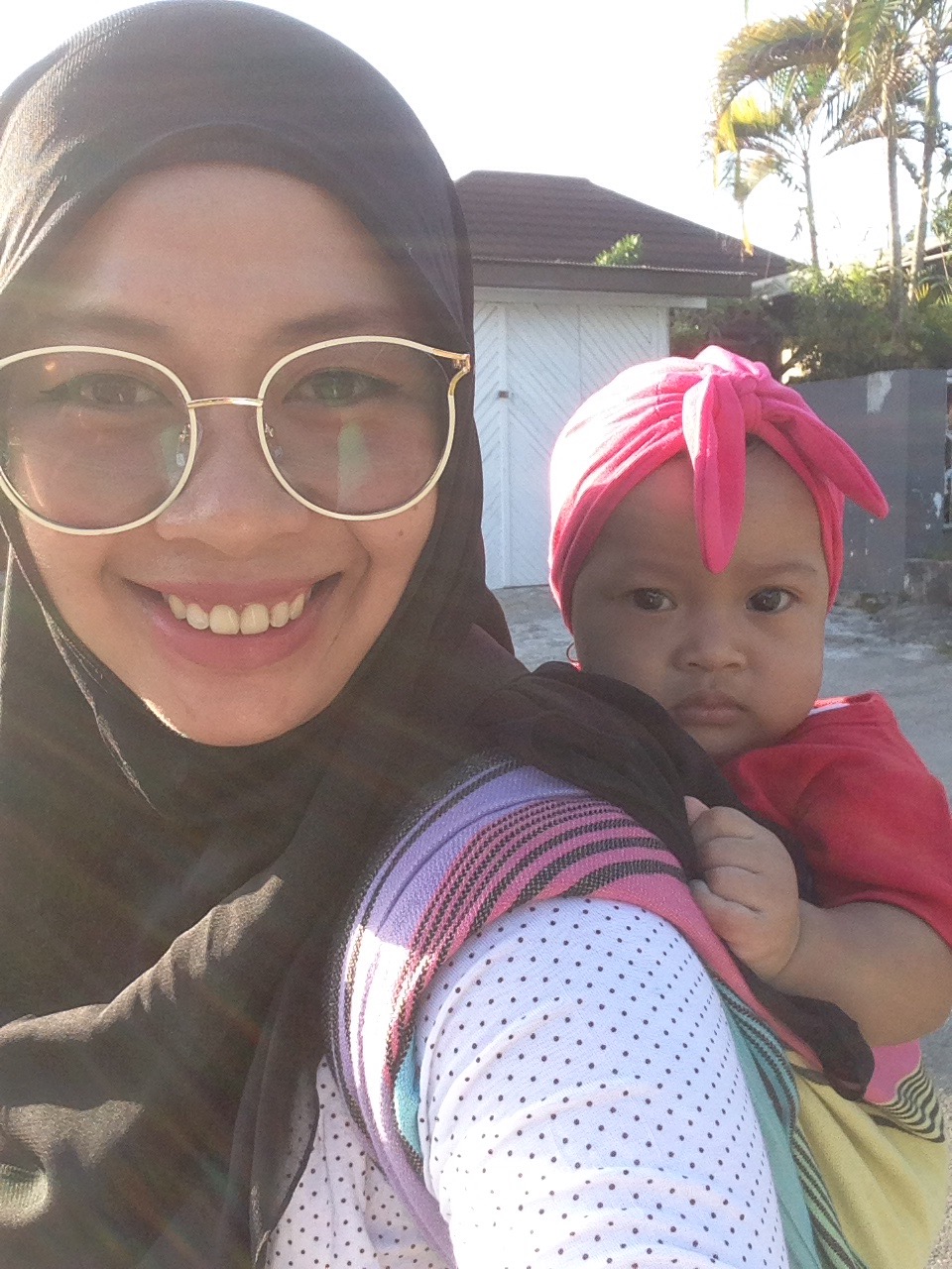 Masih dalam nuansa 17an, kebetulan di RT tempat tinggal saya baru saja melaksanakan jalan santai pagi ini. Sejak jauh-jauh hari, saya sudah sounding ke Cinta bahwa kami akan jalan santai bersama tetangga-tetangga. Saya juga bolak balik bilang kalau pas jalan-jalan nanti, dia akan saya gendong di belakang. Saat ini, Cinta mulai bersemangat melihat sekitarnya. Gendong belakang, saya jadikan pilihan agar pandangan Cinta menjadi lebih luas. Selain itu, medan yang mendaki gunung lewati lembah, lebih cocok jika menggendong belakang. Saya pun memilih woven wrap Little Frog Size 3. **Biar berasa kurus gitu sih**