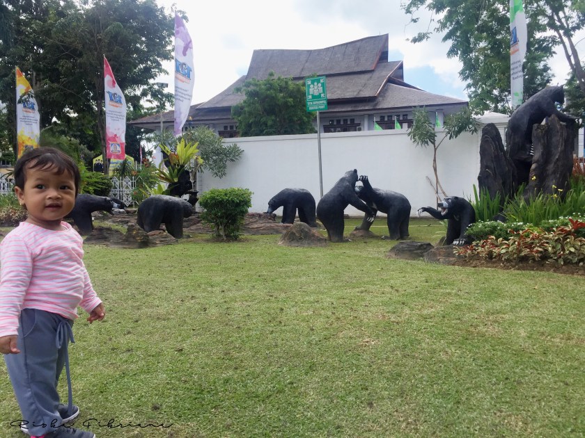 Dan benar memang, begitu berjalan di rumput Cinta terlihat bahagia sekali. Yang hijau-hijau memang menyegarkan ya nak. Tapi begitu melihat patung beruang madu, Cinta agak takut. Karena memang patungnya seperti beruang madu sungguhan. Bahkan kukunya sangat tajam.