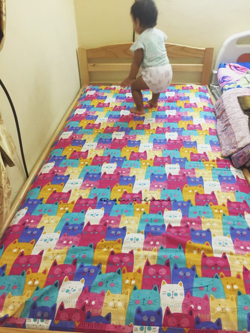 Karena dijahit sendiri dengan penuh cinta, tentu saja jahitan sprei sangat rapi. Ukurannya pun pas. Matras di kamar ibu jadi lebih cantik.