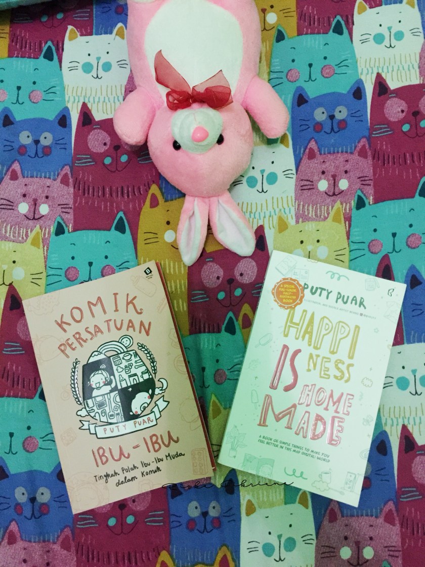 Kebetulan ada dua buku yang ringan-ringan menyenangkan dan gk bikin gendut (apasih). “Happiness is Homemade” dan “Komik Persatuan Ibu-Ibu” . Kedua buku ini ditulis perempuan yang sama, yaitu Puty Puar. Buku pertamanh Happiness is Homemade menggambarkan hal-hal sederhana yang mampu membuat perempuan (mungkin terutama ibu) menciptakan kebahagiaan untuknya sendiri. Dan buku kedua mengagambarkan bagaimana perjuangan sosok perempuan yang baru menjdi ibu. Kocak dan pasti dialami para ibu (grup hug).