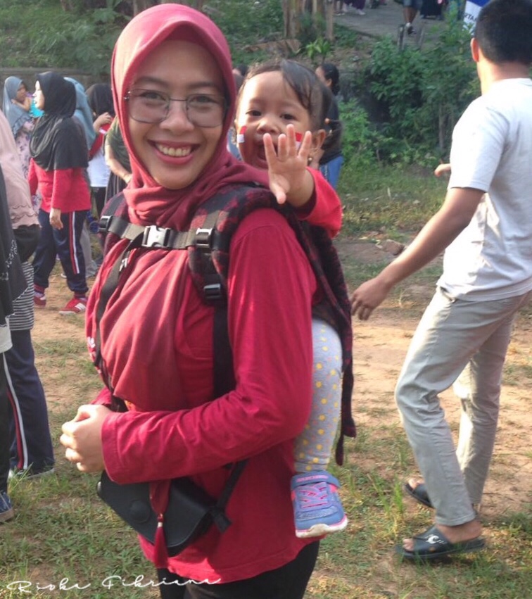 Ternyata seperti tahun lalu, saat jalan santai Cinta memilih berada di punggung mamak. Ada sih minta turun. Tapi karena medannya seperti ninja hatori, mendaki gunung lewati lembah, Cinta kembali minta digendong.