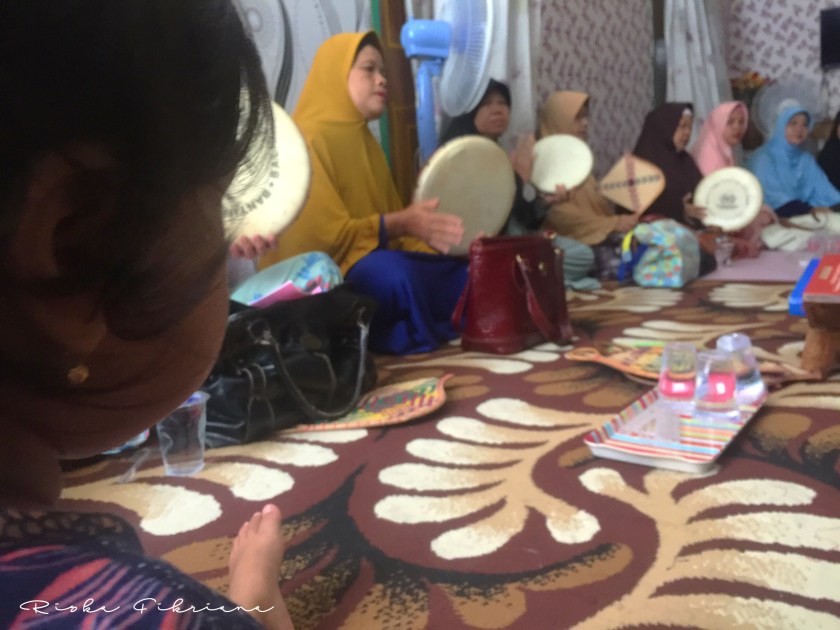 Sesampainya di tempat pengajian (kali ini rumah salahsatu warga), saya memilih duduk dekat pintu. Tentu untuk memudahkan akses Cinta keluar masuk jika merasa bosan. Setengah jam pengajian berlangsung, Cinta masih tenang. Palingan pindah duduk dipangku uti, tetangga dan saya.