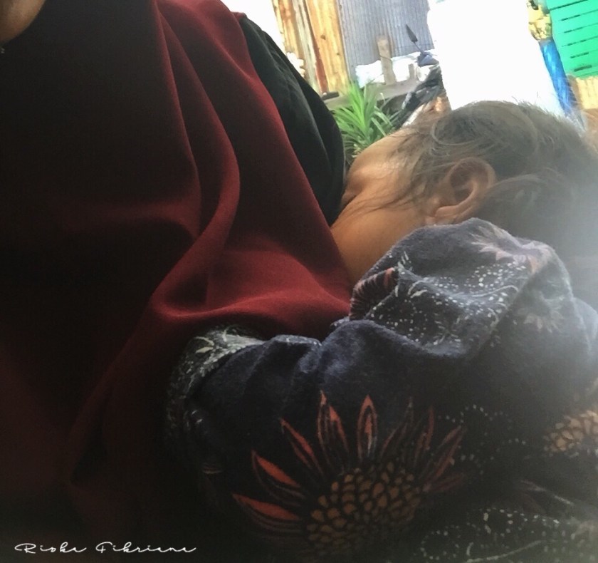 Setengah jam berikutnya, mulai eksplorasi di depan rumah. Kebetulan pengajian dilakukan siang hari, di jam tidur Cinta. Jadilah, sebentar-sebentar cinta menyusu hingga tertidur.