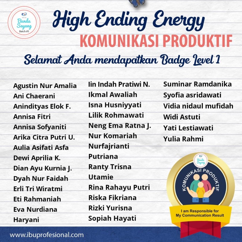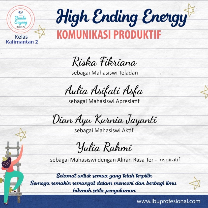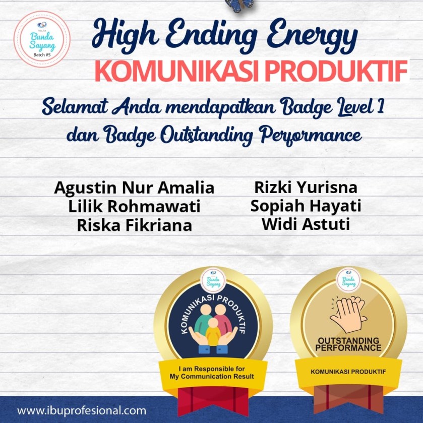Alhamdulillah, masya allah. Hari ini bahagia luar biasa. Setelah melewati tantangan Komunikasi Produktif, saya dan teman-teman sekelas di Bunda Sayang Bacth 5 Kalimantan 2, hari ini gak cuma sayang-sayangan alias jumat hangat. Tapi juga kebagian High Ending Energi.