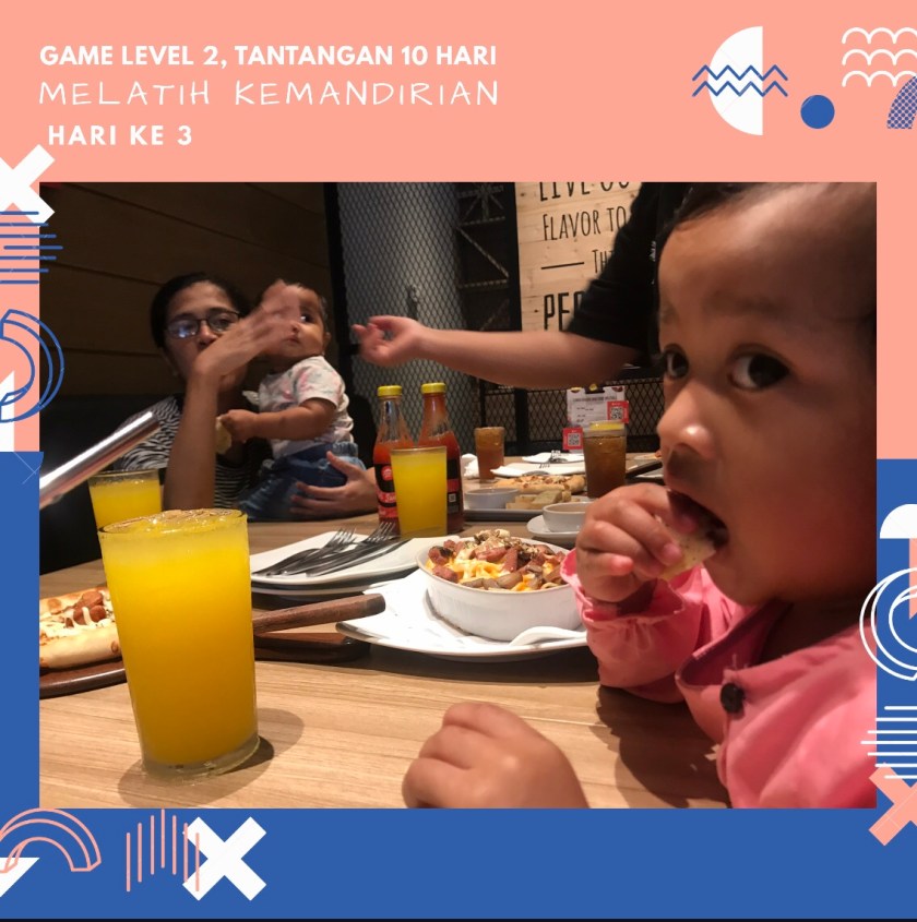 Hari ini, sungguh menggembirakan buat saya. Tantangn pekan ini yang saya pilih, melatih makan sendiri, tentu tidak hanya sekali di lakukan. Minimal 3 kali. Belum termasuk selingannya.