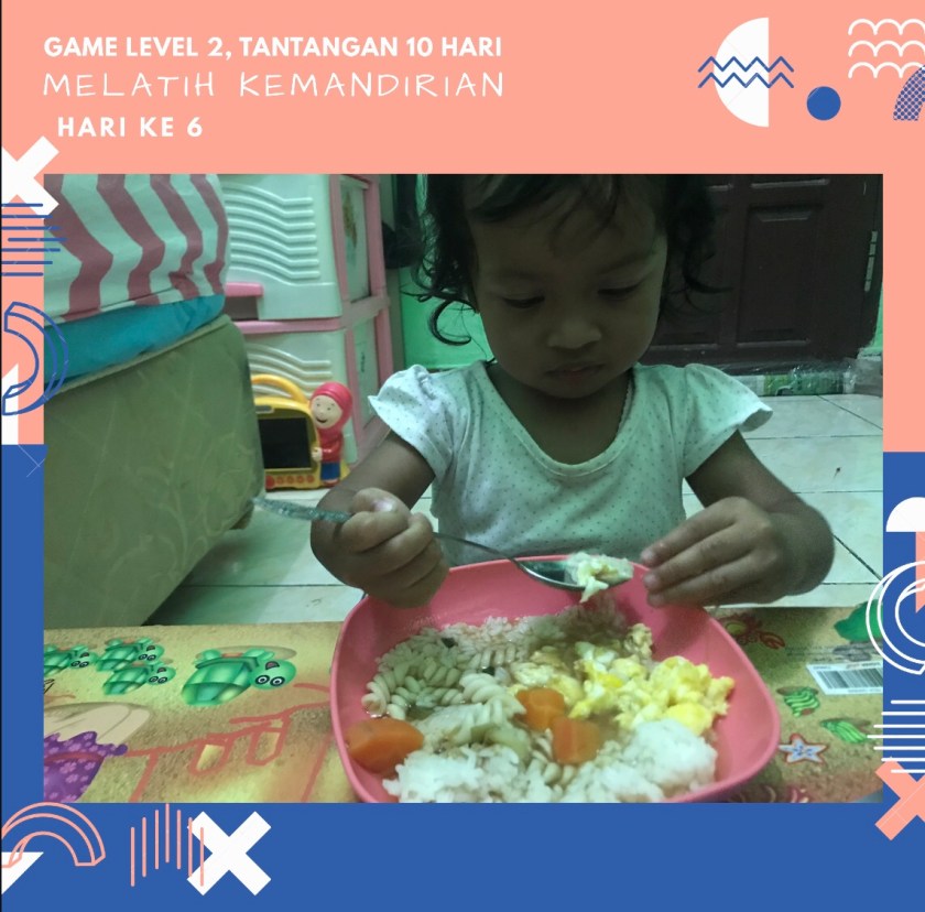 Untuk menunjukkan kalau makanannya tidak panas, saya suapi Cinta. Karena tiba-tiba papahnya minta bantuan, sayapun menghentikan suapin di sendok ketiga. Ketika saya kembali kehadapan Cinta, ternyata ia melanjutkan makannya sendiri. Yeay. “Yeay, kakak bisa makan sendiri. Kakak anak mandiri,” ujar saya. Cintapun tertawa dan melanjutkan makannya.