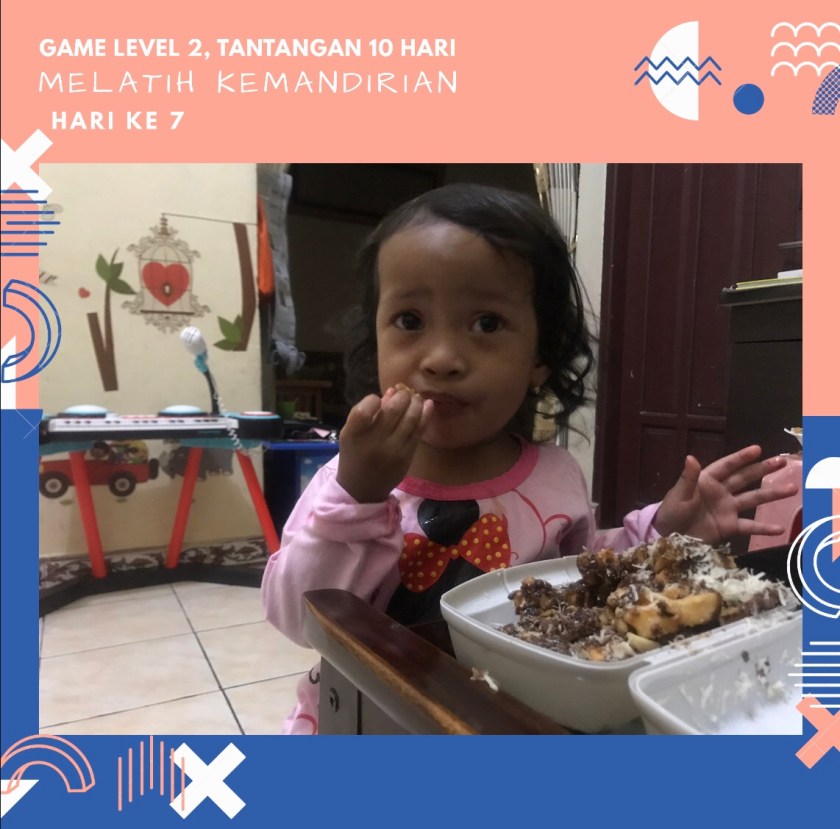 Bagaimana dengan siang atau malam hari. Ternyta Cinta masih butuh dukungan bahwa ia bisa makan tanpa bantuan saya atau neneknya. Di awal-awal, Cinta memang memelas minta disuapi. Tapi begitu saya terlambat menyuapi, ia langsung makan sendiri😅. Entah gak sabar menunggu atah sudah lapar berat.
