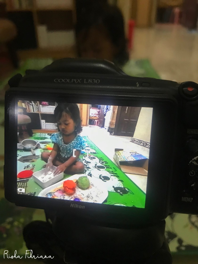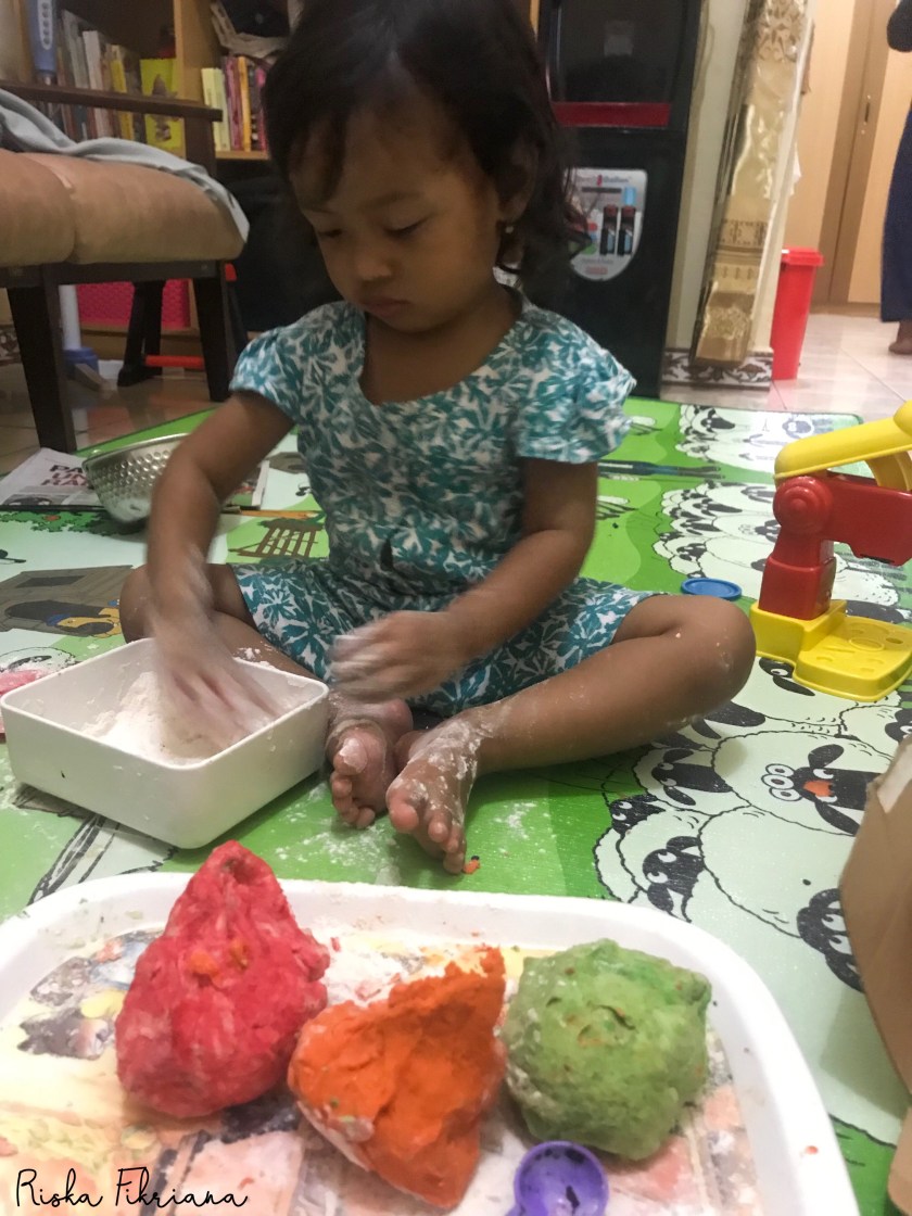 Ternyata membuat playdough tidak semudah yang saya bayangkan. Salut deh sama ibu-ibu yang rajin membuat permainan sensori untuk anaknya. Saya kudu mencontek semangatnya nih.