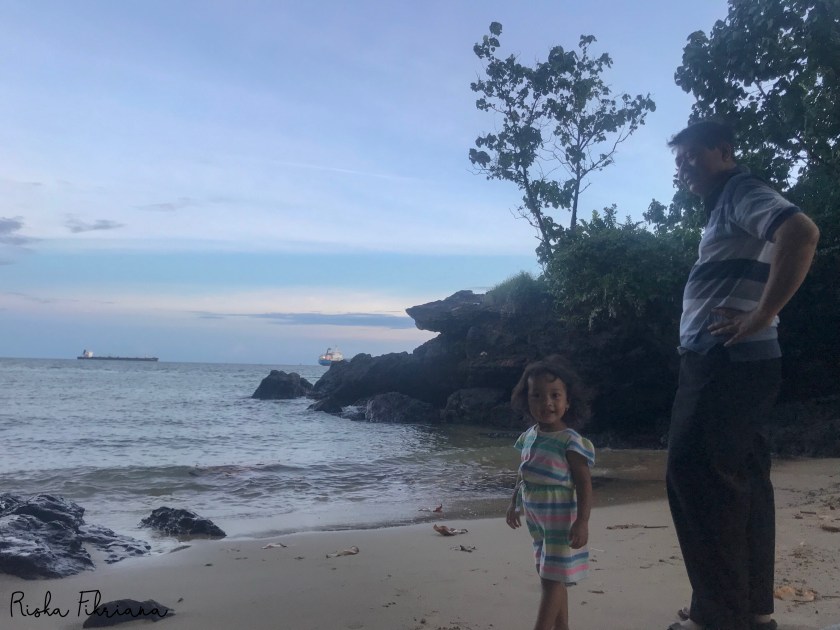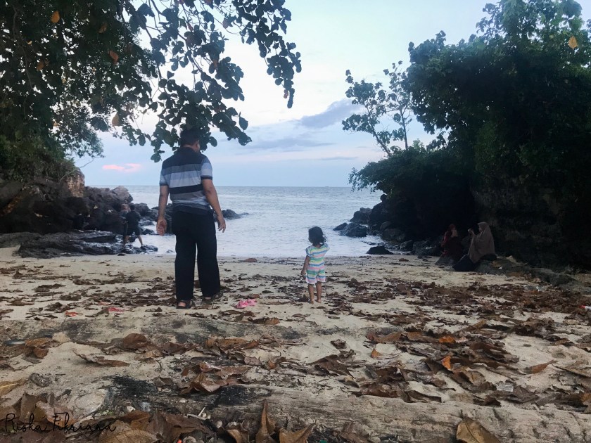 Bukan hanya menikmati pasir pantai dan deburan ombak, Cinta juga menikmati perjalanan ke batu-batu. Hutan kecil ini membuat Cinta seakan-akan berpetualang. “Teman-teman hati-hati ya, jalannya tidak rata. Ada pohon juga. Awas jatuh,” ujarnya menirukan blogger anak-anak. Sontak ini membuat semua keluarga tertawa.
