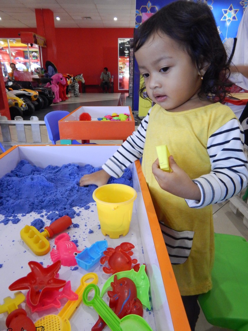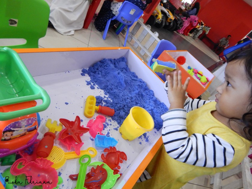 Karena cukup sering ke pusat perbelanjaan ini – yang bagian bawahnya adalah pasar – Cinta cukup hapal bahwa ada arena bermain pasir yang bisa ia kunjungi. Setelah asyik menemani berkeliling, saat waktu salat Jumat, Cinta mengajak saya bernegoisasi. Yups, ia ingin berkain pasir sembari menunggu mbahnya selesai salat.