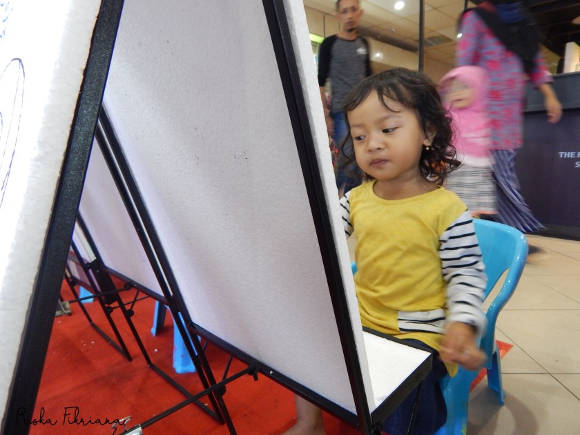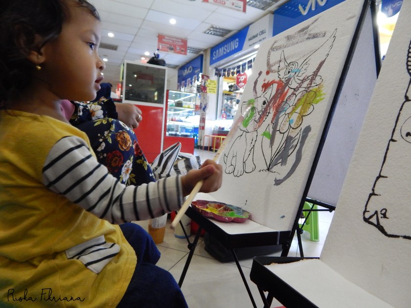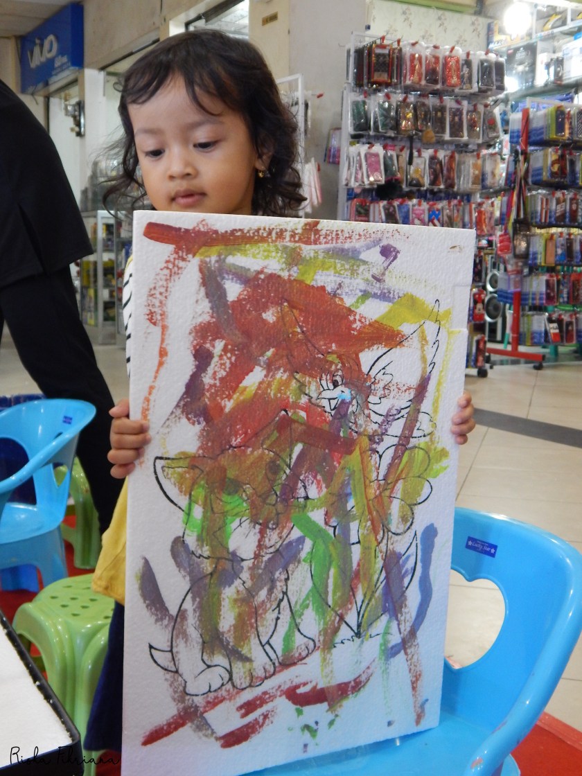 Untuk anak seusia Cinta, saya memilih untuk membebaskan ia menorehkan warna. Meski dalam kacamata orang dewasa apa sih ini. Hahaha.