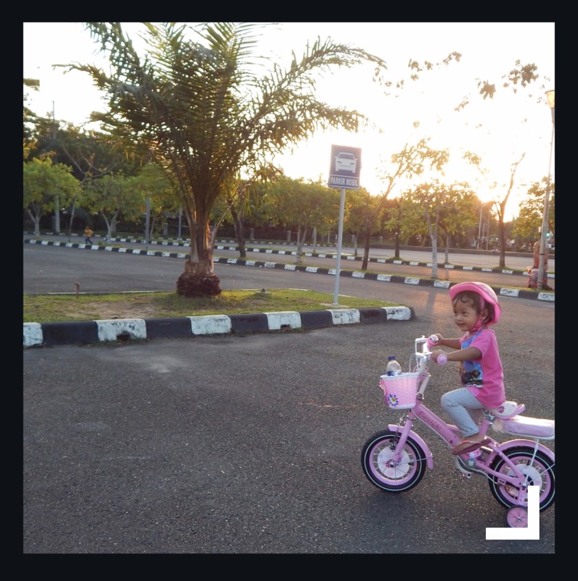 Ini, pertama kalinya Cinta mengayuh sepeda roda empat. Sebelumnya, saya pernah menyewakan sepeda tanpa kayuh untuk melatih keseimbanganya. Ada banyak manfaatnya menggunakan sepeda tanpa kayuh. Tapi di Balikpapan belum banyak peminatnya. Suami dan ibu saya juga tidak setuju jika saya bersikeras membelinya. Mestinya saya yang lebih bertekad ya 😶.