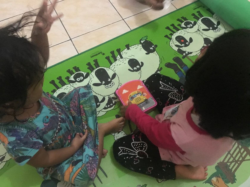 Sesaat setelah kedatangan Bila, tanpa perlawanan dan tangisan Cinta menurut begitu saya ajak mandi dan sarapan. Tampaknya, ia memang butuh teman di setiap pagi. Teman seusianya.