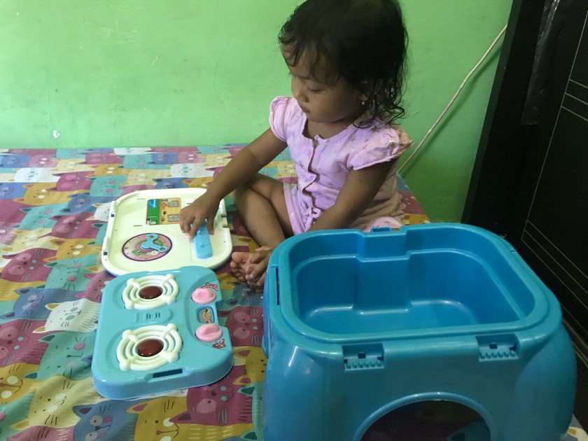 Karena tidak enak badan, Cintapun banyak ikutan menemani saya di tempat tidur. Bersama saya dan papahnya, ia membawa beberapa mainan. Seperti buku dan masak-masakan.