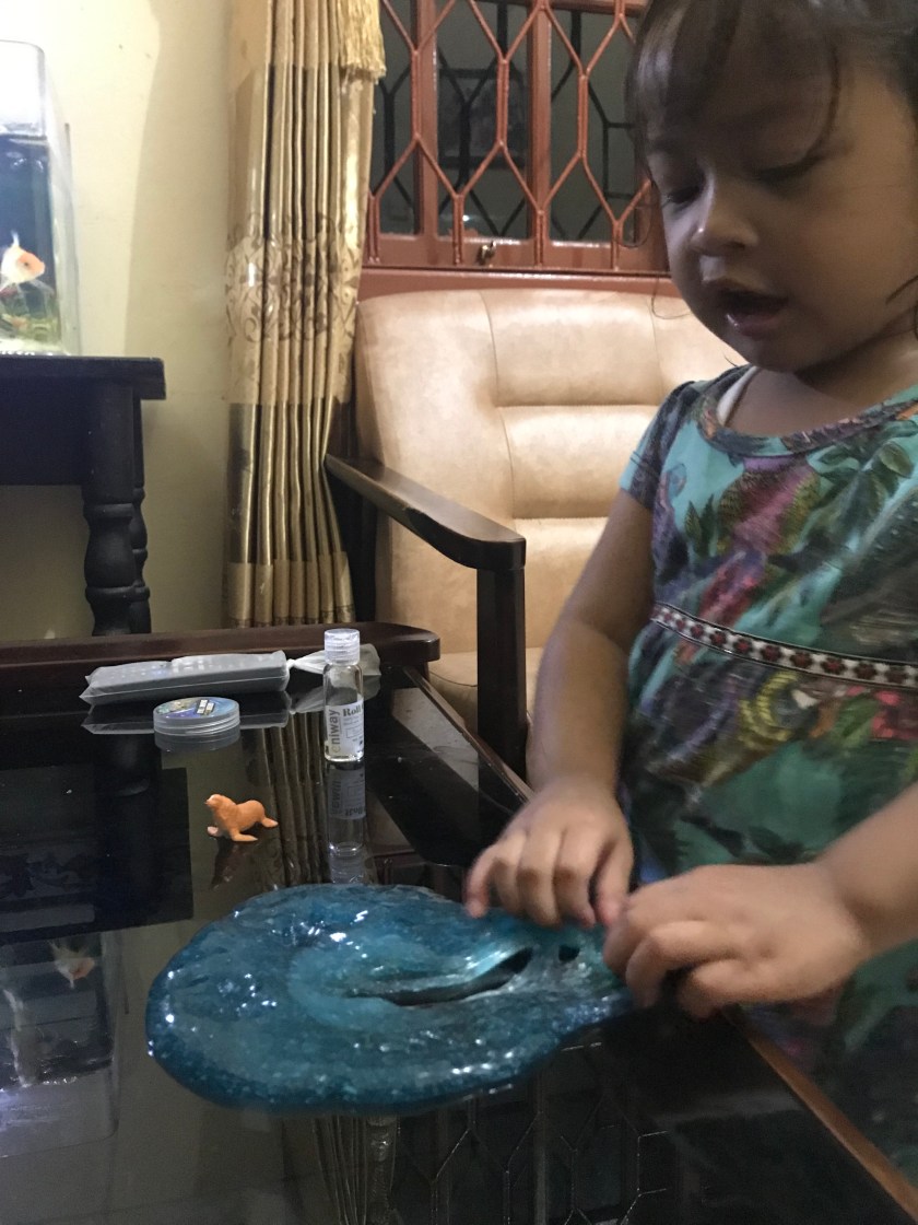 Akhir pekan ini, salahsatu kakak sepupu Cinta menginap di rumah. Nindy namanya. Sudah lama, Nindy sangat menyukai bermain slime. Bahkan, saya dan Nindy sempat praktik cara membuat slime sendiri.