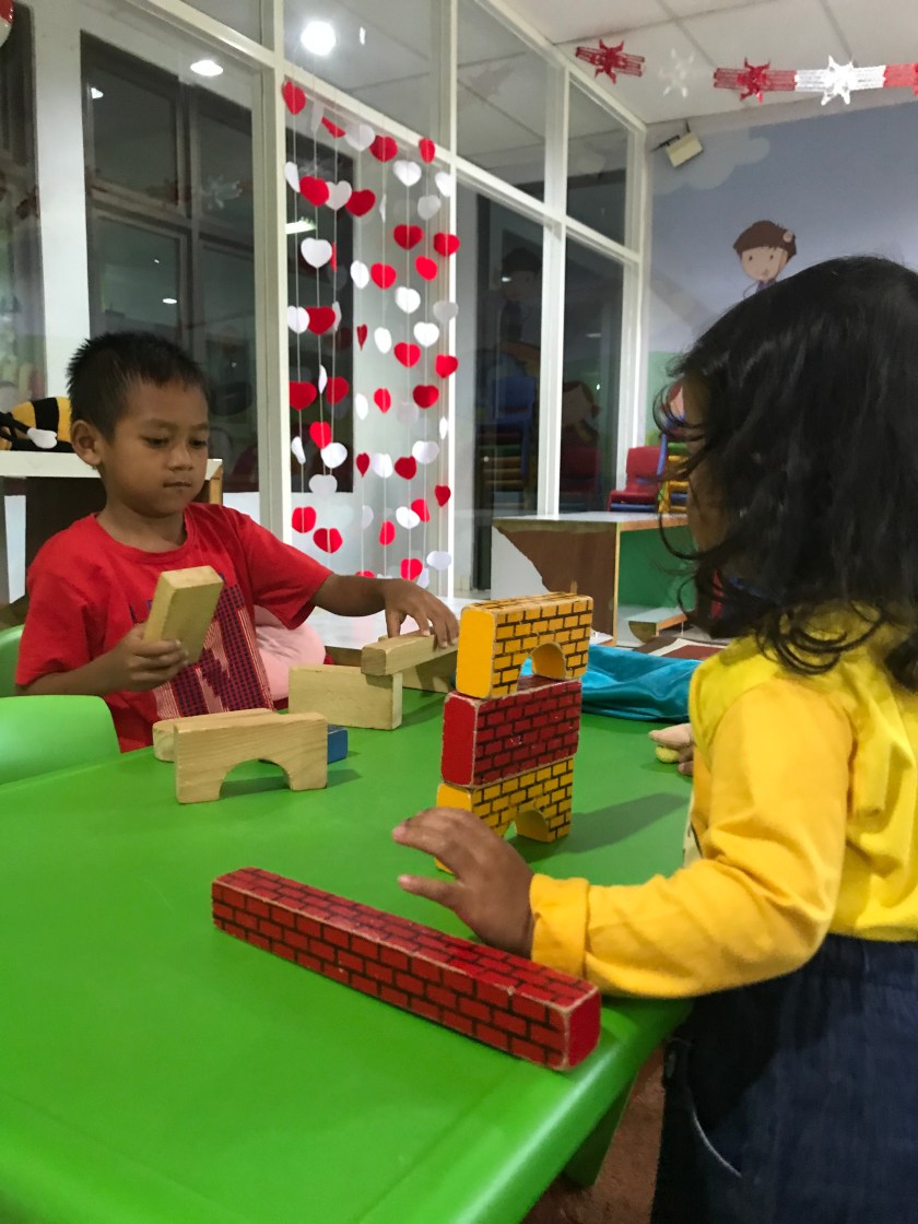 Usai solat Dzuhur, kami menuju lantai 2. Di depan ruangan buku ada ruangan bermain. Cinta dan Hafiz otomatis bergerak ke sana. 🙈
