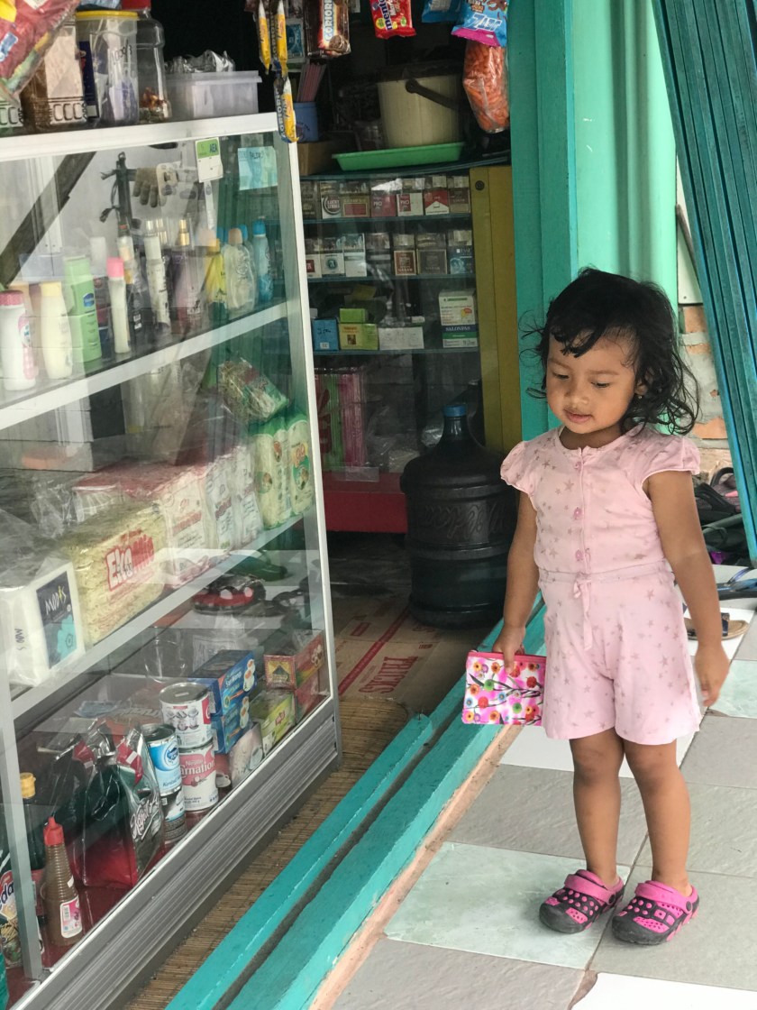 Sore tadi, kami berjalan sore keliling kampung. Ada tiga warung yang sudah kami lewati. Dan di warung keempat, Cinta meminta unuk dibelikan jajanan.