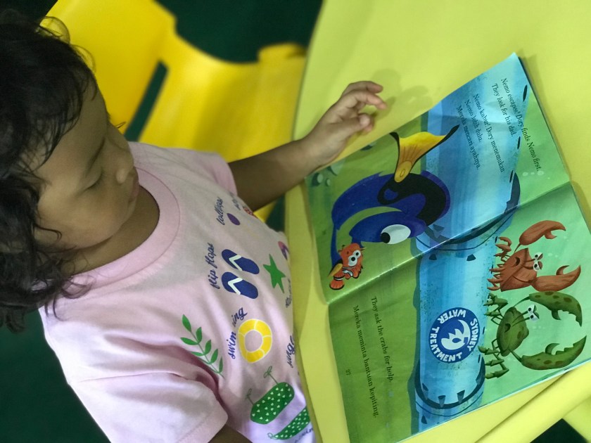 Usai membuat kartu anggota, kami semua naik ke lantai 2. Ruangan yang menyediakan buku khusus anak-anak. Semuanya berhambur menuju rak favorit masing-masing. Saya, Cinta dan Rangga pun mengambil posisi untuk membaca.