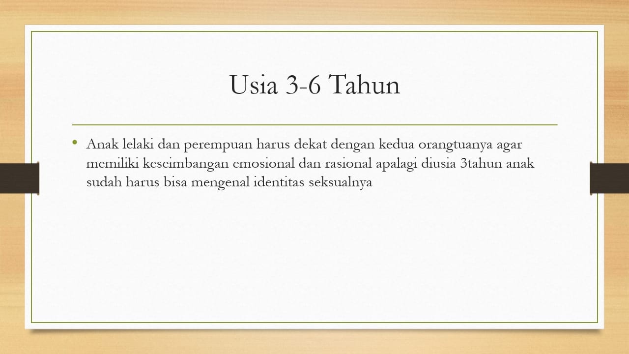 🐰usia 3 – 6 tahun anak lelaki dan anak perempuan harus dekat dengan ayah ibunya agar memiliki keseimbangan emosional dan rasional apalagi anak sudah harus memastikan identitas seksualitasnya sejak usia 3 tahun.