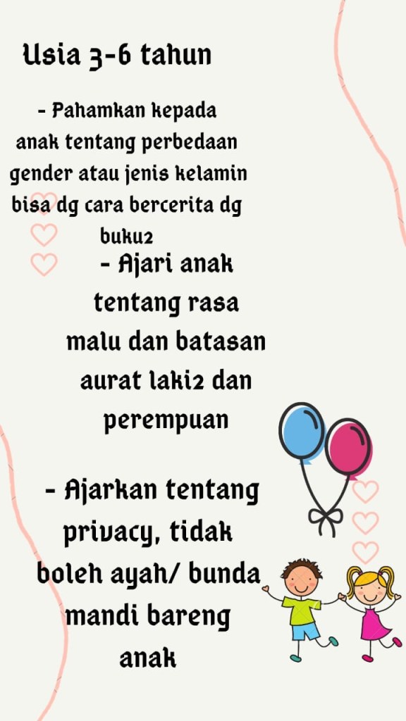 Setelah tadi dibahas definisi dan kegiatan ya g mengarah ke fitrah seksualitas anak, saya kali ini kebagian membahas Tips menjaga fitrah seksualitas anak sesuai usia