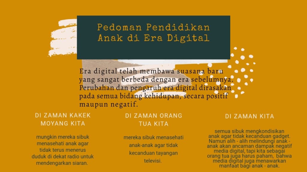Anak-anak yang hidup di era digital dan media sosial seperti saat ini jelas berbeda dengan anak-anak yang lahir, besar serta tumbuh tanpa teknologi. Sehingga orangtua pun harus cepat beradaptasi dan banyak belajar untuk mendidik anak-anak mereka. Kini, bukan hanya orang-orang kaya saja yang bisa memiliki dan mengaksesnya, mulai dari kalangan bawah, menengah hingga kalangan atas bebas mengaksesnya.