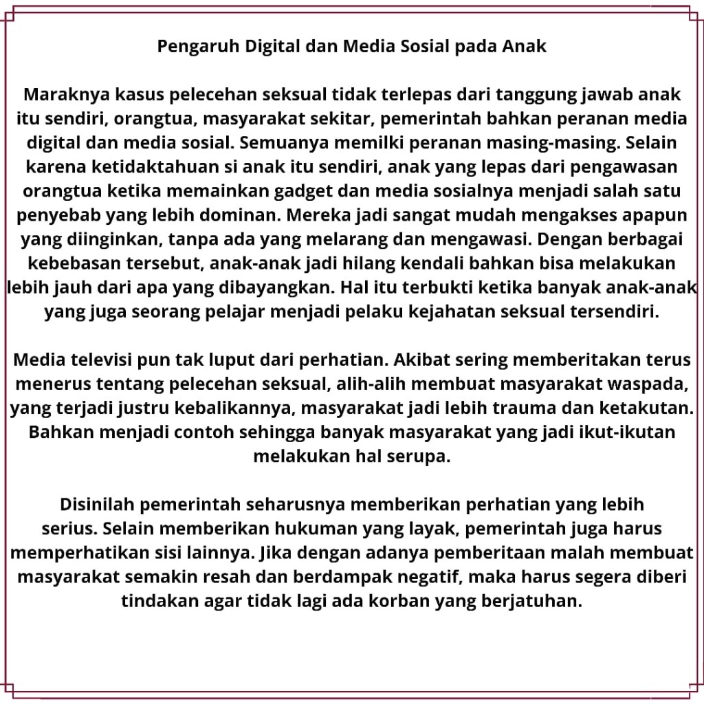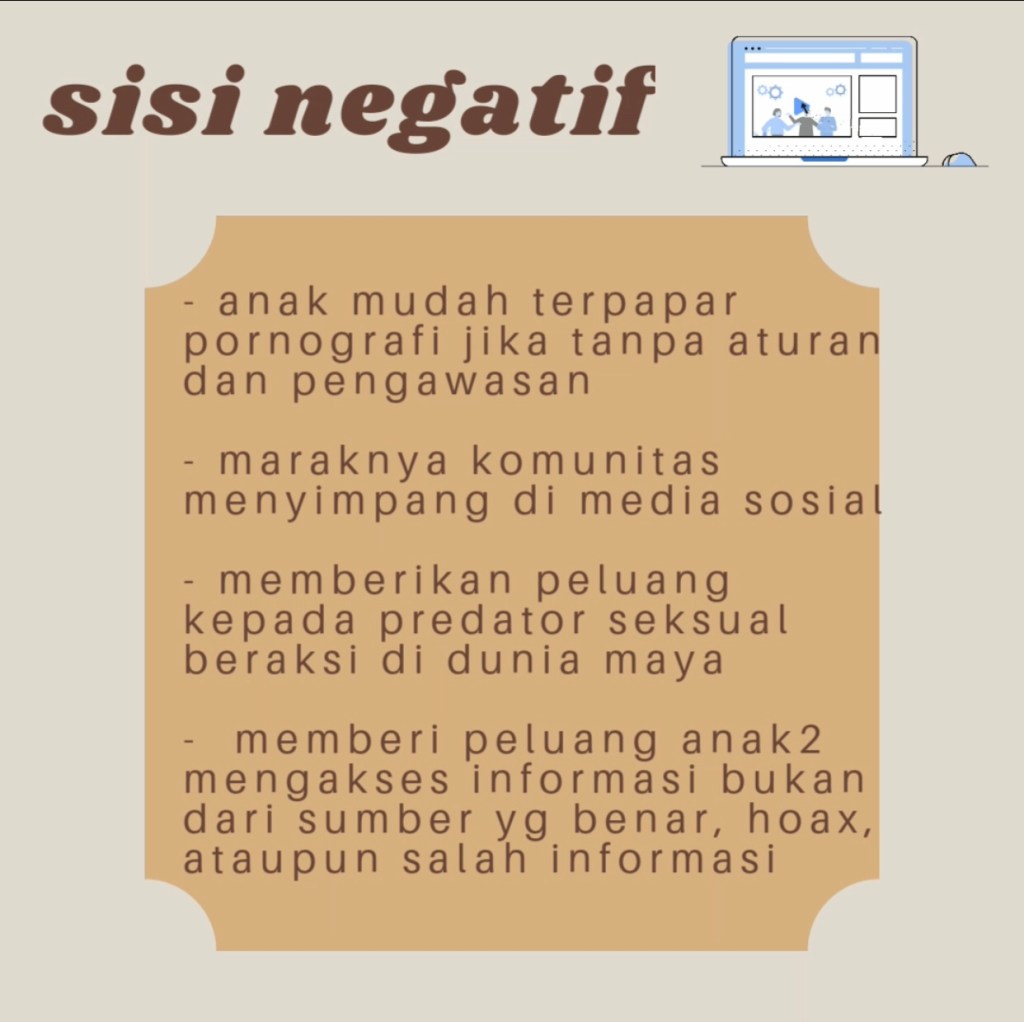Berbagai kemudahan teknologi yang ada, menuntut orang-orang yang menggunakannya secara bijak. Tetapi anak-anak yang masih polos dalam berpikir dan sikapnya menjadi hal yang menakutkan jika tak ada yang bisa mengarahkan mereka. Maka peran orantua disini sangat penting, agar bisa mengarahkan dan mendidik anak-anaknya yang hidup di era digital dan media sosial.