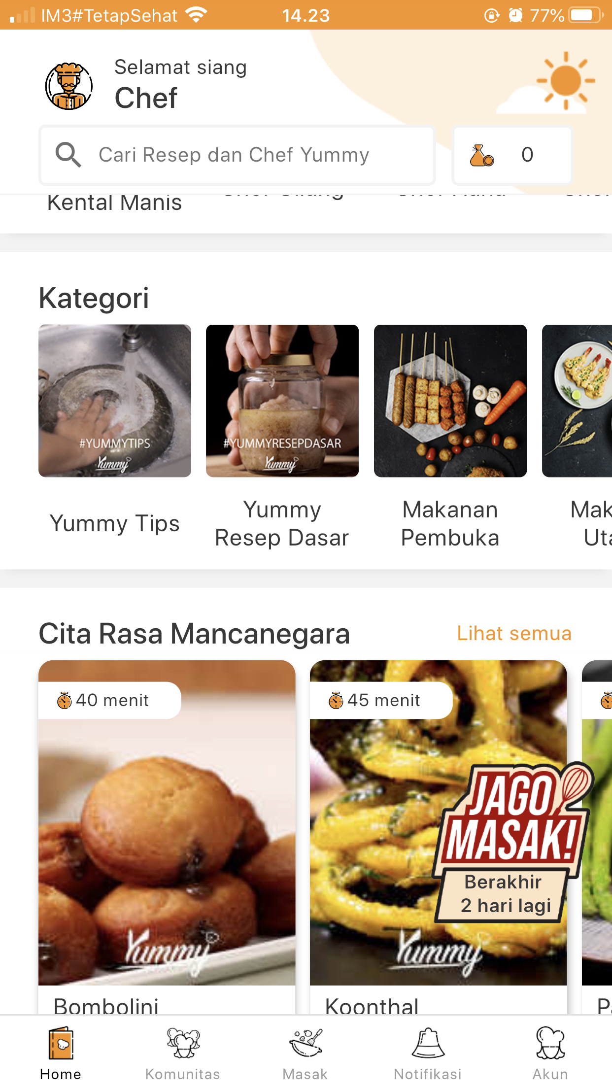 Begitu selesai diunduh, sayapun membuka aplikasinya. Hidung saya kembang kempis saat membaca sapaan di bagian atas aplikasi. āHai Chef,ā . Kepercayaan diri saya langsung melambung, ha-ha.