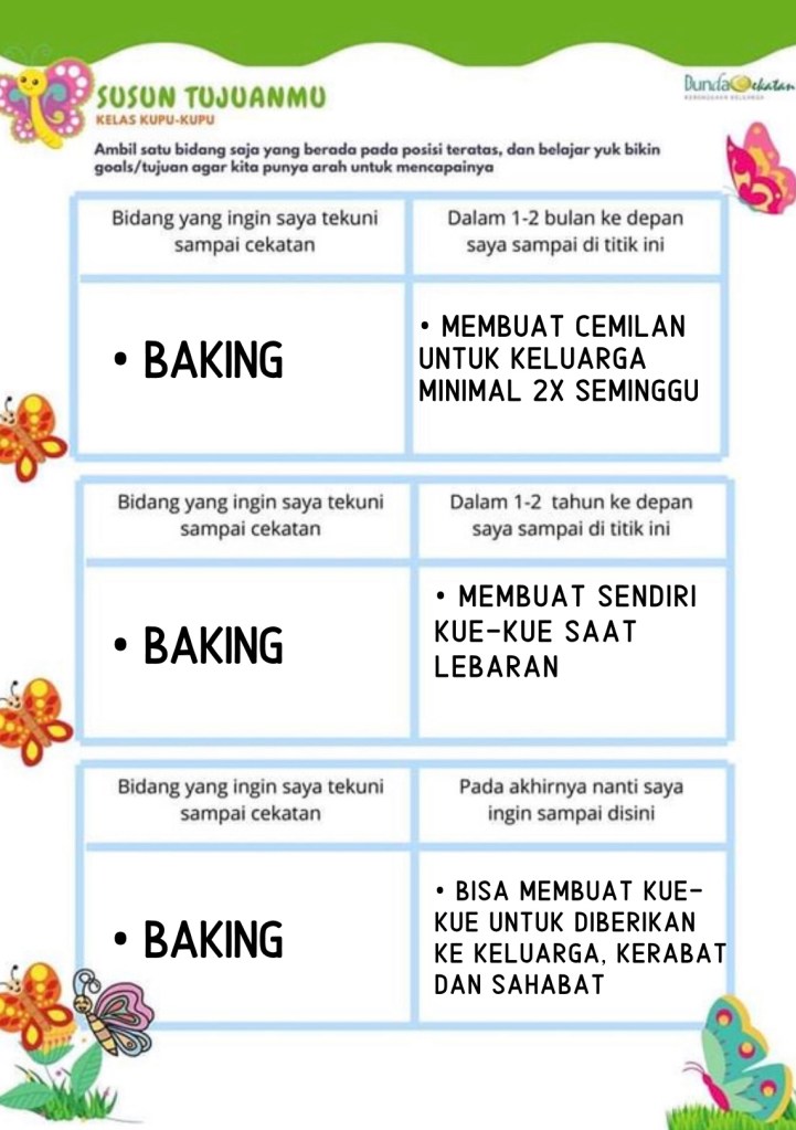Entah mengapa, di setiap hari senin dan selasa saya selalu merasa banyak kupu-kupu di perut saya. Masih ada rasa takut dan kurang percaya diri pada kemampuan. Terkadang saya masih juga bertanya-tanya, apakah sudah tepat pilihan saya dalam menjalani kelas Bunda Cekatan Batch II ini.