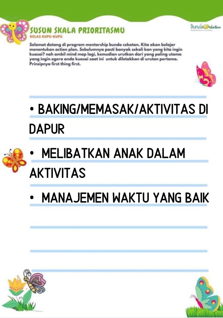 Maka, tiga skala prioritas yang saya tulis adalah Di dapur (memasak atau membuat kue) , beraktivitas bersama anak (dan manajemen waktu yang baik.