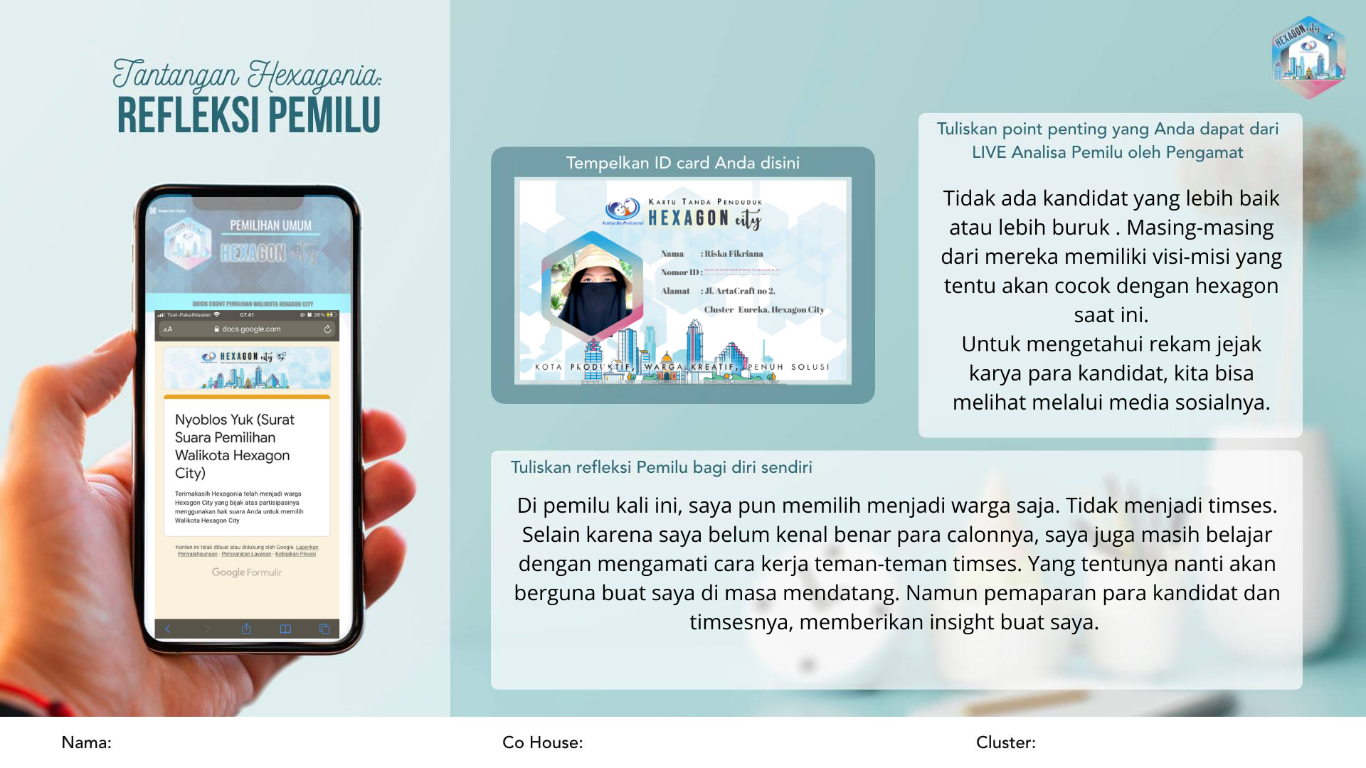 Sabtu, lalu kami warga Hexagon City melakukan pencoblosan. Selama masa pemilu, teman-teman di co-house dan cluster sering bercengkrama. Tidak sedikit dari kami yang saling mengingatkan ketika ada jadwal kampanye atau video yang tayang di FBG.