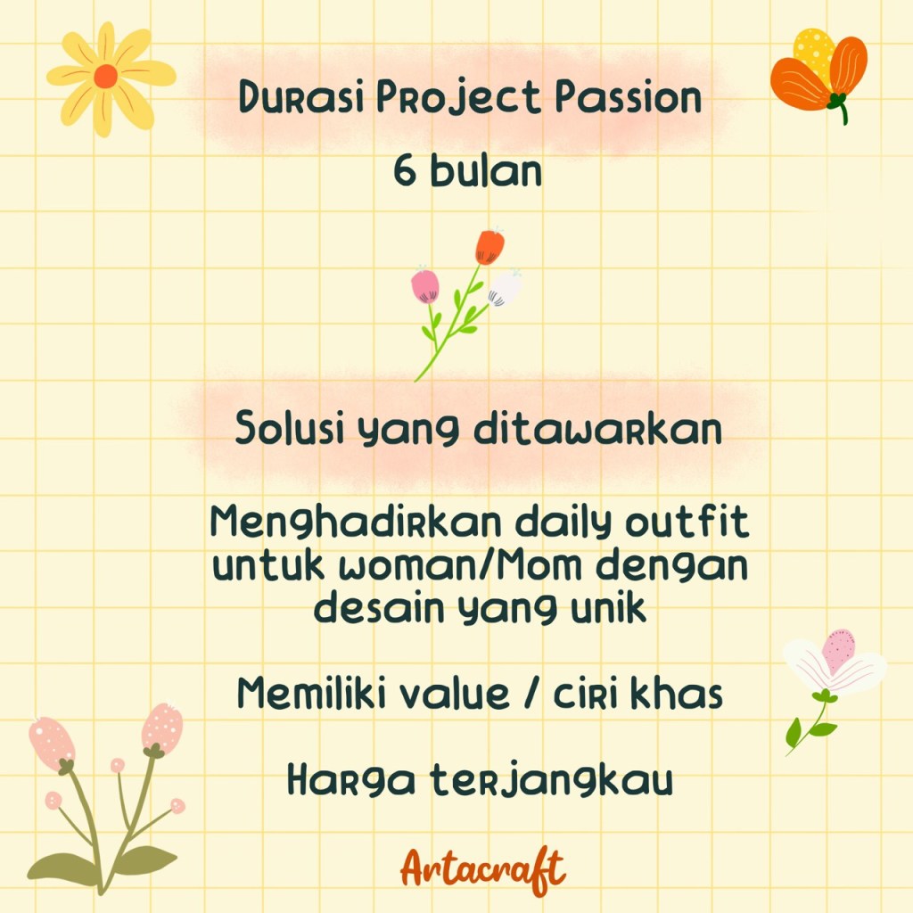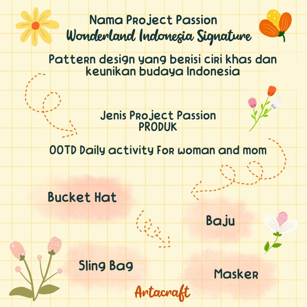 Project passionya diberi nama Wonderland Indonesi Signature. Patternnya menggambarkan ciri khas dan keunikan budaya indonesia. Produk yang dihasilkan OOTD untuk perempuan. Seperti bucket hat, baju, sling bag dan masker.