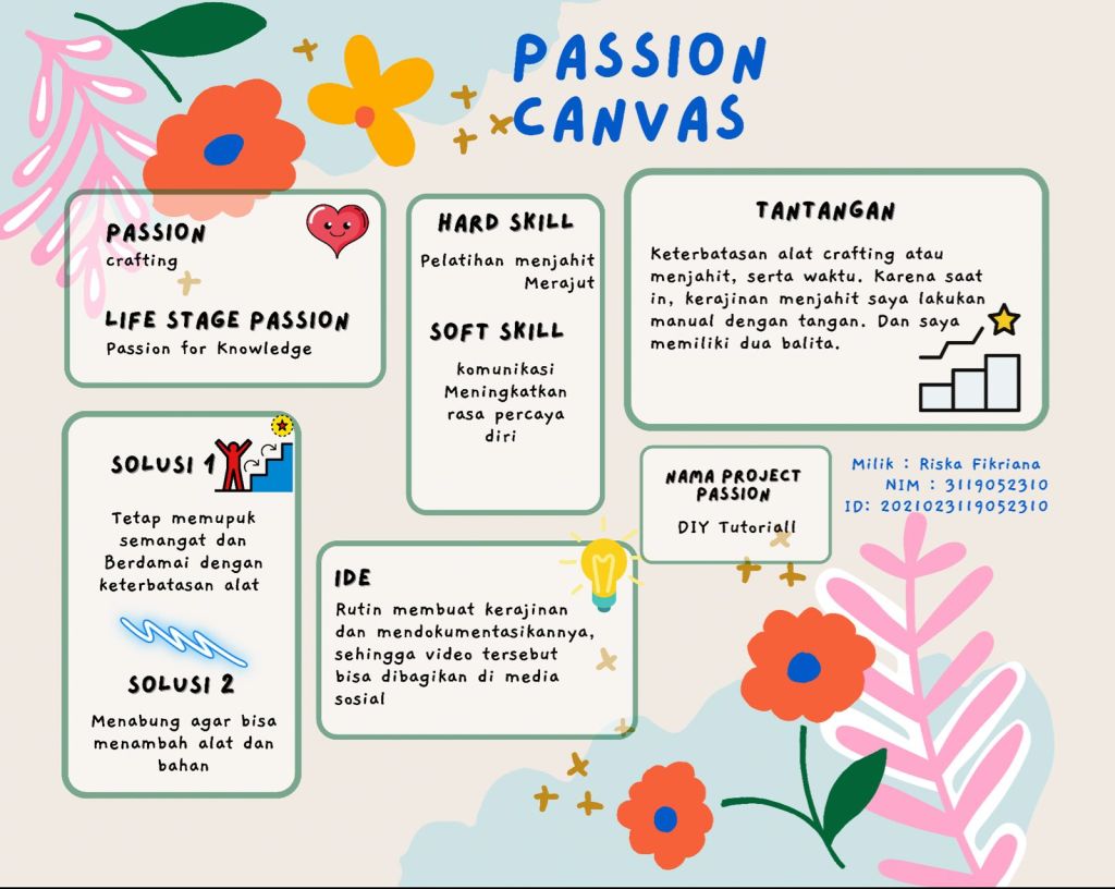 Dari materi tersebut sayapun mulai menuliskan passion canvas. Setelah menuliskannya, saya dan teman-teman satu co house membagikannya di wag. Kamipun melanjutkan diskusi untuk menarik benang merahnya.