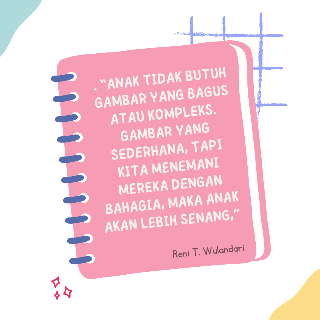 Lalu apa hubungannya dengan menggambar? Dengan menggambar anak-anak bisa berimajinasi dengan mengembangkan kreativitas mereka. Tapi bagaimana jika orangtua tidak pandai menggambar? Kita bisa mengajak anak melihat bentuk di sekitar kita yang paling sederhana. Misalkan rumah yang bisa digambarkan dengan gabungan segiga dan persegi panjang. “Anak tidak butuh gambar yang bagus atau kompleks. Gambar yang sederhana, tapi kita menemani mereka dengan bahagia, maka anak akan lebih senang,” kata Reni.