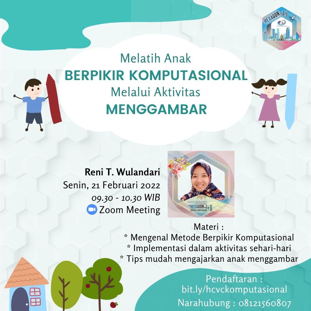 Senin, 21 Februari lalu aku bertugas menjadi Butterfly di Hexagon City Virtual Conference. Speaker pertama yang kuhinggapi adalah Reni T. Wulandari dengan tema Melatih Anak Berpikir Komputasional Melalui Aktivitas Menggambar. Apa itu berpikir komputasional? Berpikir komputasional atau Computational Thinking adalah metode menyelesaikan persoalan dengan menerapkan teknik ilmu komputer. Ini mendorong anak untuk berpikir kreatif dan kritis dalam menyelesaikan persoalan dengan menerapkan konsep terstruktur.