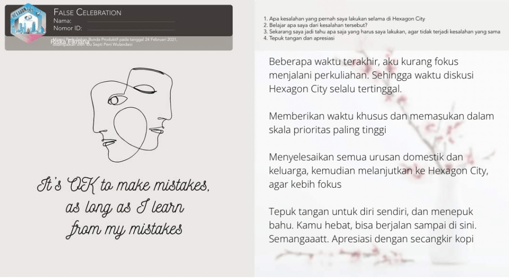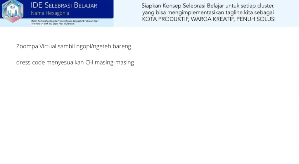 Lah, sudah di zona N? Awalnya aku kira kami hexagonia masih di zona O pekan ke 3. Tak terasa sebentar lagi perkuliahan segera berakhir. Ada banyak cerita dan pengalaman luar biasa di perkuliahan Bunda Produktif ini.