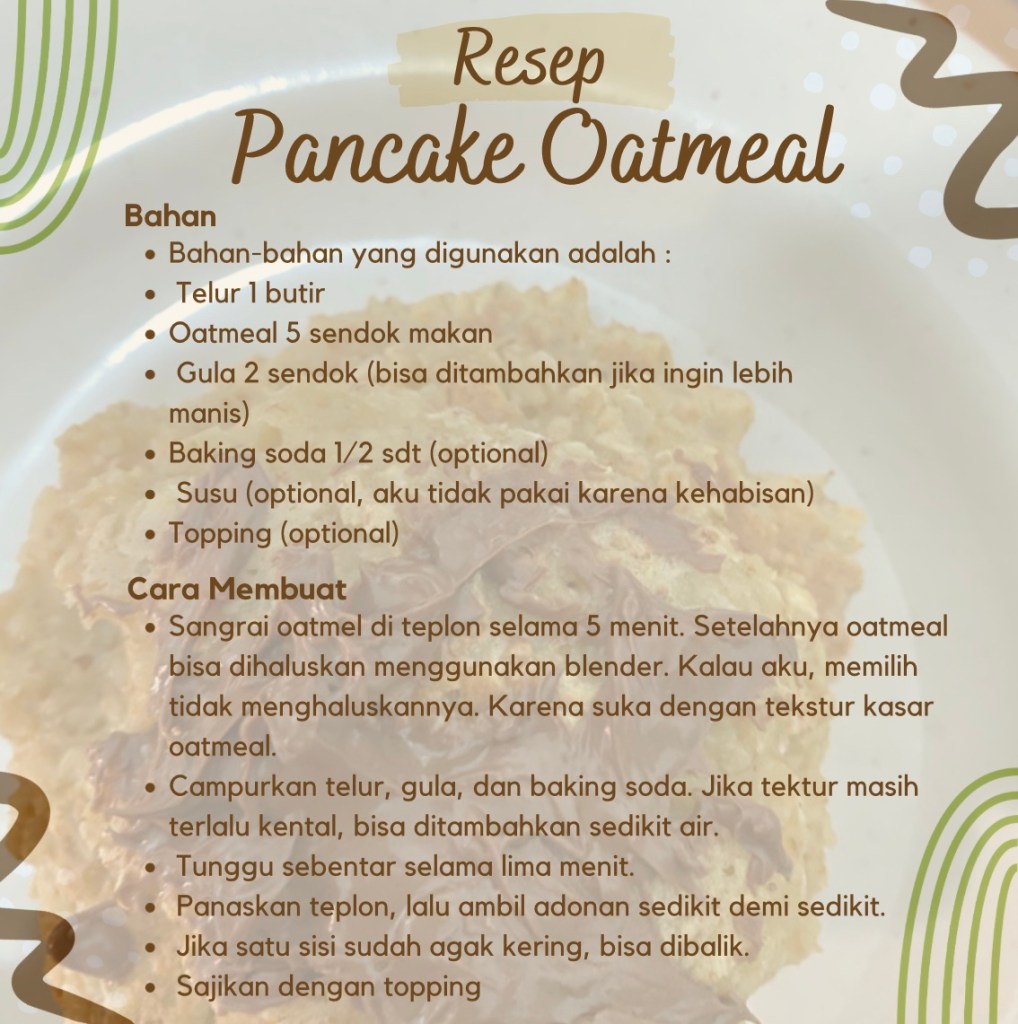 Bagaimana rasanya? Tak jauh berbeda dengan pancake biasanya. Hanya saja, jika oatmealnya tidak dihaluskan rasanaya lebih padat dan berteksture. Jika menikmati pancake oatmeal ini aku memilih menggunakan topping. Bisa mengunakan selai coklat ataupun madu. Berbeda jika menggunakan tepung terigu dan ditambah susu, rasanya lebih manis dan lembut.