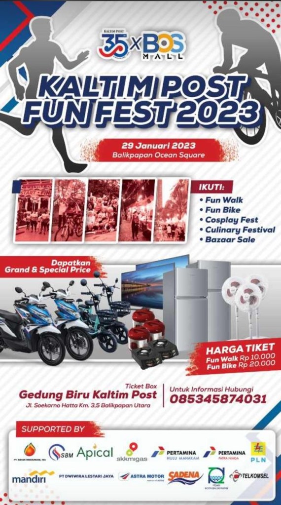 Dan di HUT ke 35 kali ini, ada Kaltim Post Fun Fest 2023. Kegiatannya diadakan di Balikpapan dan Samarinda dengan waktu yang berbeda. Di Balikpapan, kegiatan baru akan dilakukan pada 29 Januari 2023. Bertempat di Balikpapan Ocean Square, akan ada fun walk, fun bike, cosplay fest, culinary festival dan bazar sale. Harga tiket fun walk hanya Rp 10.000,/ lembar sedangkan fun bike hanya Rp 20.000,/lembar.