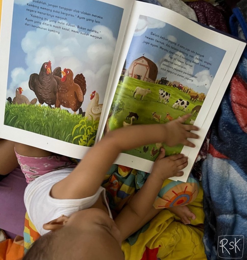 Jadi membaca bersama anak 1 tahun, 4 tahun dan 7 tahun tak hanya interaktif, tapi juga memberikan imajinasi yang menyenangkan.