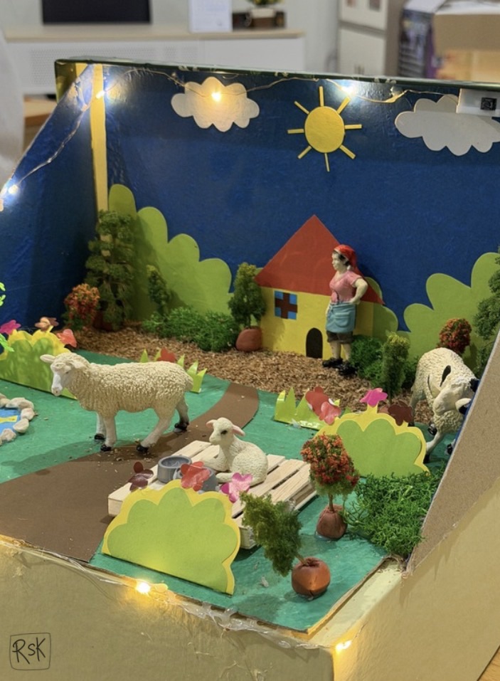 Kami pun mulai mengerjakan diorama dari kertas. Temanya bebas—dari dinosaurus, hewan laut, hingga peternakan. Aku membantu mengumpulkan bahan, termasuk memanfaatkan kotak hampers yang ada di rumah agar panggungnya lebih kokoh.